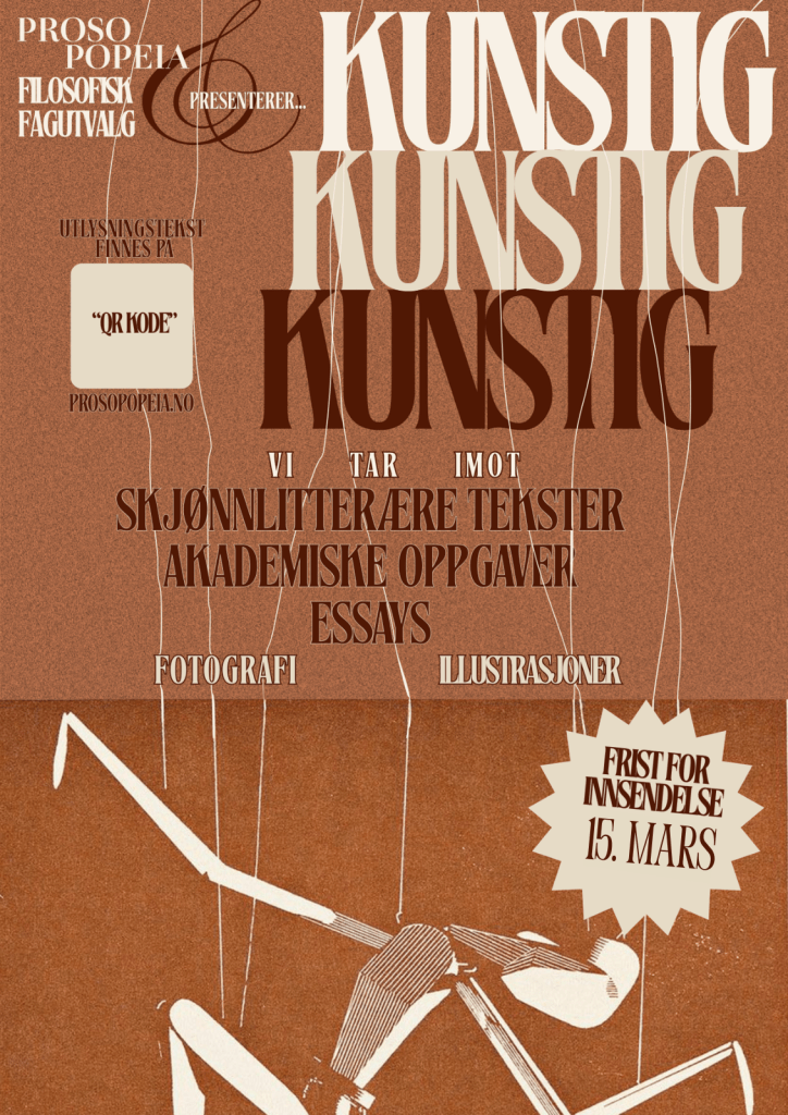 Temaet for neste utgave av Prosopopeia er «Kunstig», et ord som i dag er fanget i diskursen rundt våre voldsomme teknologiske fremskritt innen kunstig intelligens. Kanskje himles det allerede med øynene fra skribenter som har kommet tilbake fra juleferie etter lange diskusjoner med familie om ansvarlig og kritisk bruk av ChatGPT, eller fra HF-studenter som har sett seg nødt til å forsvare hvordan utdanningen deres fortsatt er relevant. Til tross for hvor overveldende stor assosiasjon begrepet «Kunstig» har fått til «Kunstig Intelligens» de siste årene, er det ikke kun denne ene smale veien Prosopopeia ønsker å sende våre potensielle skribenter nedover. Ordet “Kunstig” defineres gjennomgående opp mot sine antonymer – det ekte, naturlige, originale. På et sosialt plan er samtiden vår preget av et ønske om å være autentisk – å «holde det ekte», som det heter. I tråd med dette vil man gjerne unngå å bli karakterisert som oppstilt, tilgjort og performativ. Men hva er det som gjør oss kunstige?